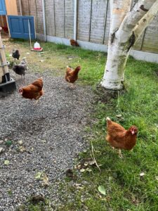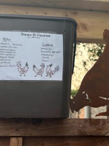 We provide brown bins to the householder that lists what food scraps and peelings suitable for our chickens. Each chicken has their own name and personality!